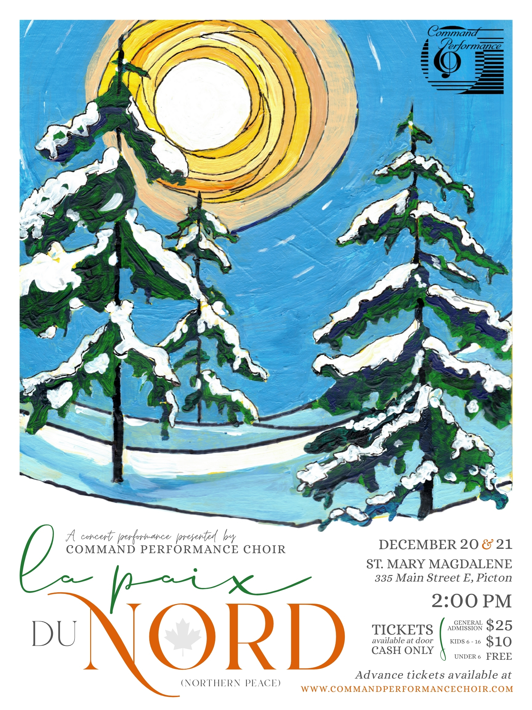 Command Performance Choir presents La Paix du Nord (Northern Peace), a winter themed concert celebrating the vast, diverse regions of Canada and weaving their landscapes, cultures, and voices into one harmonious experience.